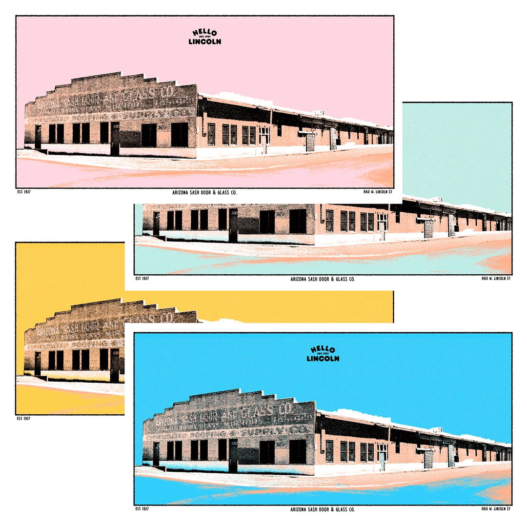 Hello Lincoln, home to Hello Merch & Hello Screen Printing, is a historic structure in the Downtown Phoenix historic Warehouse District. The original building was constructed in 1927 for the Arizona Sash, Door & Glass Company. The builder was G.F. Williams and the cost of the work was estimated at $15,663. Although the building permit, which is dated October 7, 1927, shows the address as 742 West Lincoln Street, city directories consistently show the address as 521 South 9th Avenue. The 1928 City Directory shows that the manager of the plant was Gustavus E. Engstrom and that the company’s slogan was “Glass of All Kinds.”